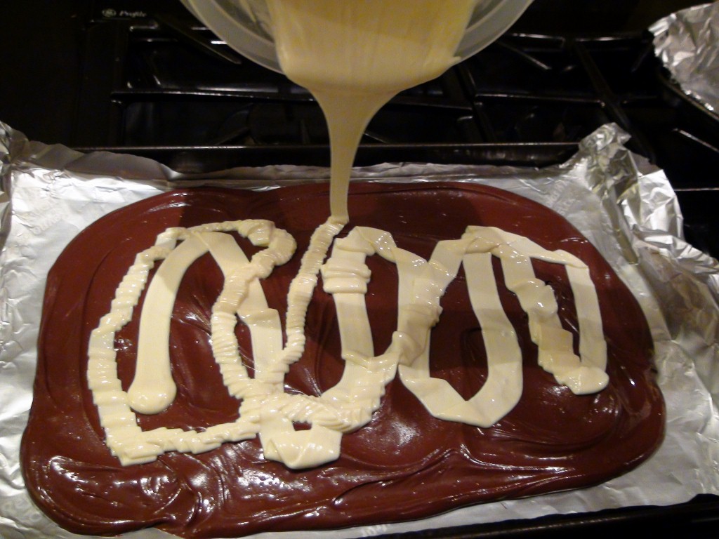 Drizzle melted white chocolate over semi-sweet chocolate and then take butter knife or back of a spoon and swirl into the semi-sweet until your chocolates are marble (swirl VERY gently you just want to achieve the marble look on top, you do not want to stir the two chocolates together)