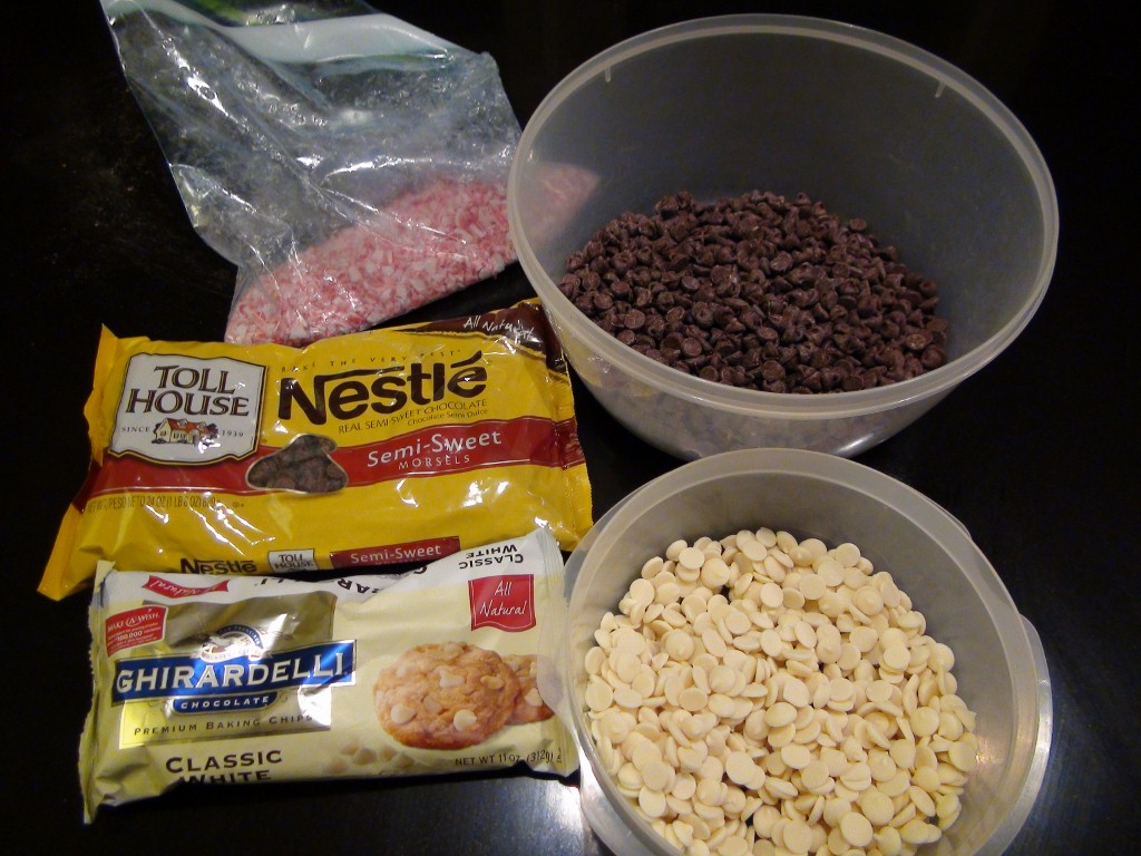 After first minute has passed in the microwave, remove and stir, if white chips have not melted add back to the microwave in 15 second intervals, removing the bowl each time to stir until white chocolate is fully melted (be careful not to burn the chocolate, remember you have less white chocolate than you do semi-sweet so it should not take you as long to melt the white chocolate as it did the semi-sweet)
