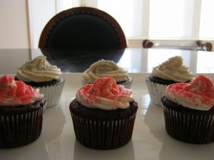 INGREDIENTS: 1 cup boiling water 3/4 cup unsweetened cocoa powder 1/2 cup milk chocolate chunks 1/2 cup whole milk 2 cups all-purpose flour 2 tbsp. baking soda 2 tbsp. baking powder 1 tbsp. sea salt 2 sticks unsalted melted butter 1 1/2 cups dark brown sugar 3/4 cup granulated sugar 4 large eggs 12 ounce container whipped Philadelphia cream cheese ¾ cup confectionate sugar 2 tbsp. pure vanilla extract colored sugar crystals READY, SET GO: 1. Preheat oven to 350 degrees 2. Whisk the boiling water and cocoa powder until smooth, then whisk in milk and pure vanilla 3. In a separate bowl sift flour, baking soda, and salt 4. In an electric mixer beat butter and sugars, then add eggs one at a time, then beat in both flour and cocoa mixtures alternately 5. With wooden or silicone spatula mix in chocolate chunks 6. Line cupcake pan with cupcake baking cups 7. Fill baking cups about 2/3 full and bake 20-25 minutes or until you stick a toothpick in the middle and it comes out clean (do not over bake) 8. Take out of oven and cupcake pan; put cupcakes on cooling rack for 10-15 minutes before icing (should be fully cooled before icing) TIME TO MAKE THE ICING - READY, SET GO: 1. Add whipped Philadelphia cream cheese, vanilla and confectionate sugar to a bowl and mix until velvety smooth 2. Spoon icing into decorating/piping bag with star tip and pipe onto top of cupcake 3. Sprinkle with colored sugar crystals 4. ENJOY